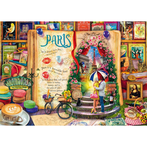 Fall in love with the City of Light in this romantic collage by Aimee Stewart. From the Eiffel Tower and café terraces to macarons and vintage art, this puzzle captures the charm, colour, and romance of Paris.