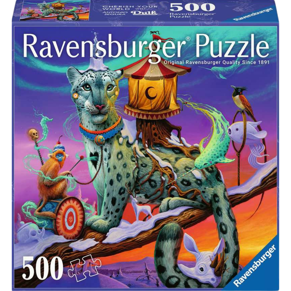 A snow leopard perches on a tree limb, carrying a tent on its back. A golden snub-nosed monkey drums nearby, while fish swim through the air. Birds perch and ethereal creatures float by. The magical twilight blends dawn and dusk.