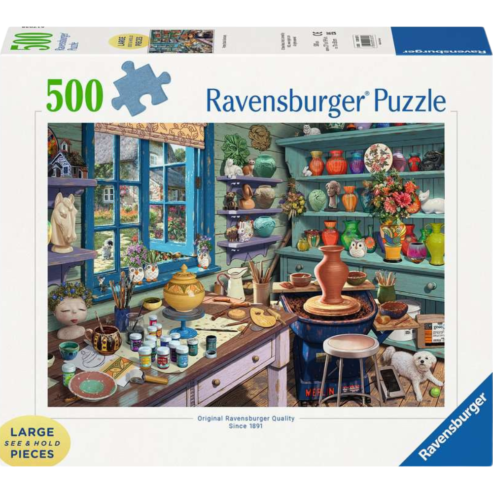 Step into a world of creativity and tranquility with this 500-piece jigsaw puzzle featuring a serene pottery studio sanctuary. This beautifully illustrated puzzle depicts a cozy studio filled with all the tools and materials needed for pottery making, capturing the essence of a peaceful retreat where artistic inspiration flows freely.