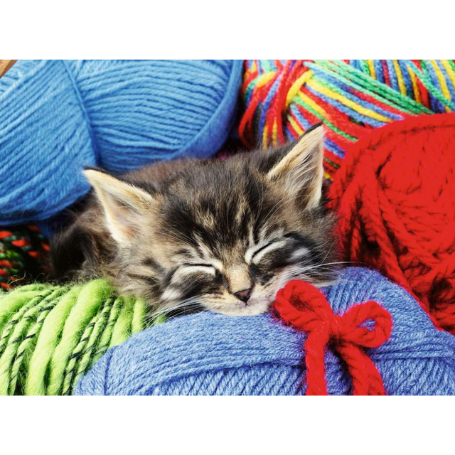 Piece together this adorable 100-piece extra-large jigsaw puzzle, featuring a cozy scene of a kitten peacefully sleeping among a soft pile of wool. Nestled in colourful yarn, the fluffy feline rests contentedly, creating a heartwarming and relaxing image.