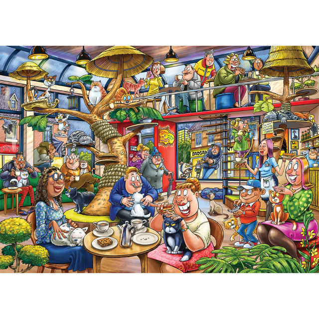 Step into the hilarious world of Wasgij? Mystery 28 - Feline Frenzy!, where chaos is about to unfold! Unlike traditional jigsaw puzzles, Wasgij challenges you to puzzle what happens next rather than recreating the image on the box. Imagine the amusing scenario that follows this seemingly calm cat café scene—what unexpected feline frenzy is about to erupt?