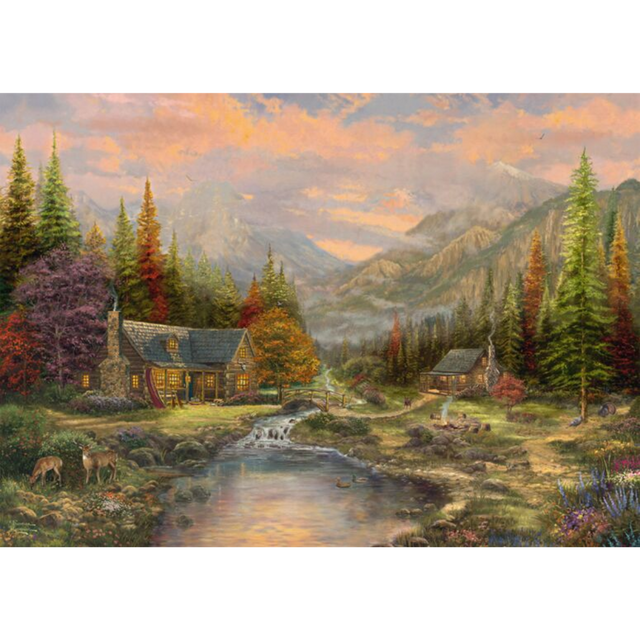 Escape to a world of tranquility and natural beauty with the Sierra Paradise 1000-piece wooden jigsaw puzzle by Schmidt, featuring the breathtaking artistry of Thomas Kinkade. This stunning scene portrays a cosy log cabin nestled among towering pine trees, set against a dramatic mountain backdrop bathed in the warm glow of a setting sun. A gentle stream flows peacefully, while deer roam the lush landscape, creating a serene and inviting atmosphere.