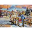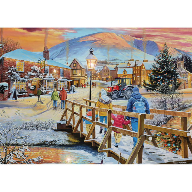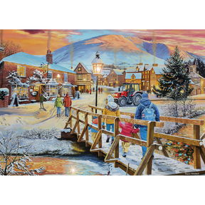 Enjoy a cosy winter scene filled with festive cheer! Families wander through a snowy village, past twinkling lights, a glowing Christmas tree, and warm shop windows. With snowy mountains in the distance and a colourful sunset overhead, this puzzle is a perfect way to celebrate the magic of the season.