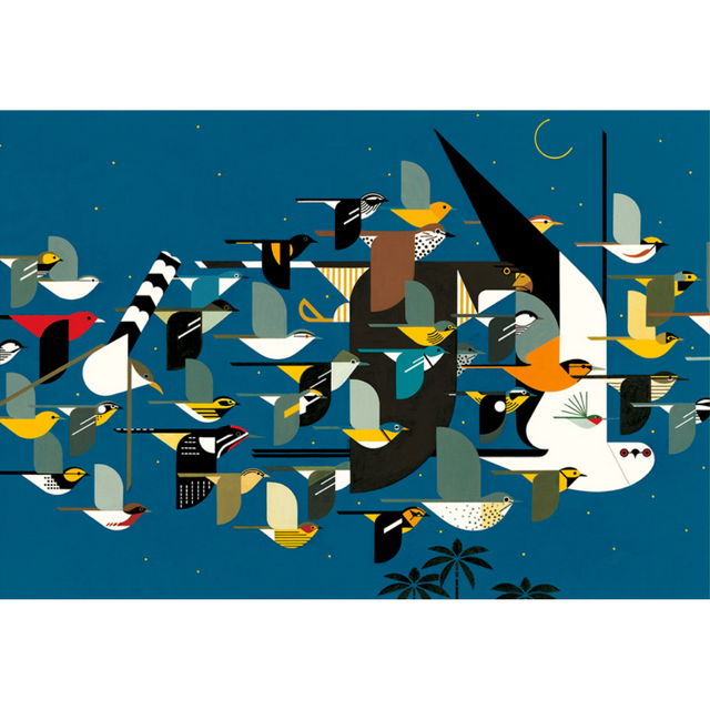 “For centuries, the neotropical migrants in this picture have shuttled between winter homes in the tropical rainforest and nesting sites in our woodlands. Now their populations are plummeting. Why? Habitat destruction. Down There? Up Here? Is your favourite songster in this flock? . . . Are silent springs forthcoming? Remember the canary in the coal mine?”—Charley Harper