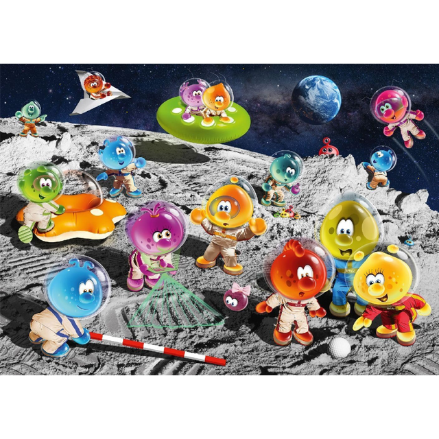 Join the SpaceBubble.Club on an intergalactic adventure with the On the Moon 1000-piece jigsaw puzzle by Schmidt! This fun and quirky scene features a group of adorable bubble-helmeted space explorers as they land on the moon, setting up their colourful camp amidst the lunar landscape. The playful mix of vivid characters and a black-and-white moon surface creates a visually striking contrast, making this puzzle both unique and entertaining.