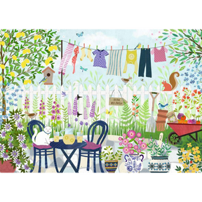 The charming scene features a cosy table and chairs where a curious cat is perched, surrounded by vibrant, colourful flowers. A line of washing flutters gently in the breeze, a wheelbarrow overflowing with fresh vegetables adds rustic charm, and a playful squirrel sits atop a white picket fence while birds and insects bring the garden to life.
